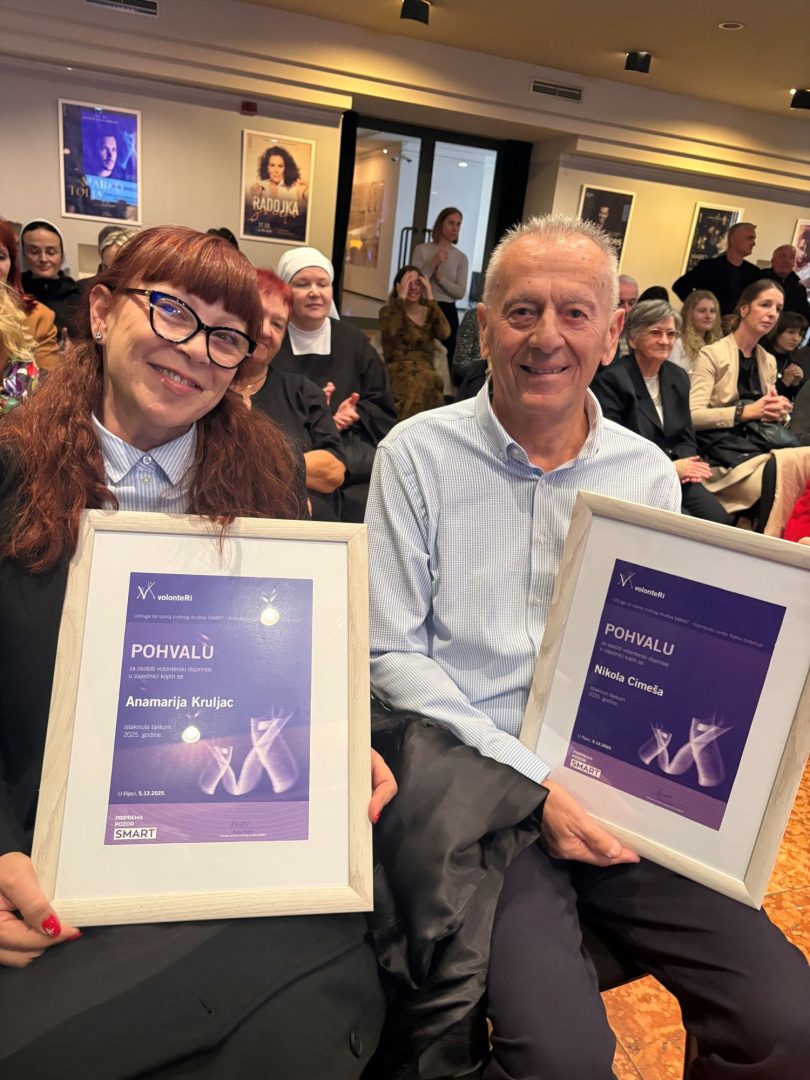 U HKD-u su ponosni na volontera Nikolu Cimešu i volonterku Anamariju Kruljac, koji su pohvaljeni za volonterski angažman na svečanosti dodjele nagrada Volonteri godine 2025. koje dodjeljuju Primorsko-goranska županija, grad Rijeka i Udruga za razvoj civilnog društva SMART-Volonterski centar Rijeka. Izlog HKD-a tijekom prosinca krasit će fotografije s volonterskih aktivnosti i tapiserija – umjetnička instalacija Nit zajedništva koju su izradile volonterke, a volonterima u čast, 5. prosinca dizalice na riječkom lukobranu i fontane na Korzu bile su osvijetljene crvenim svjetlom.