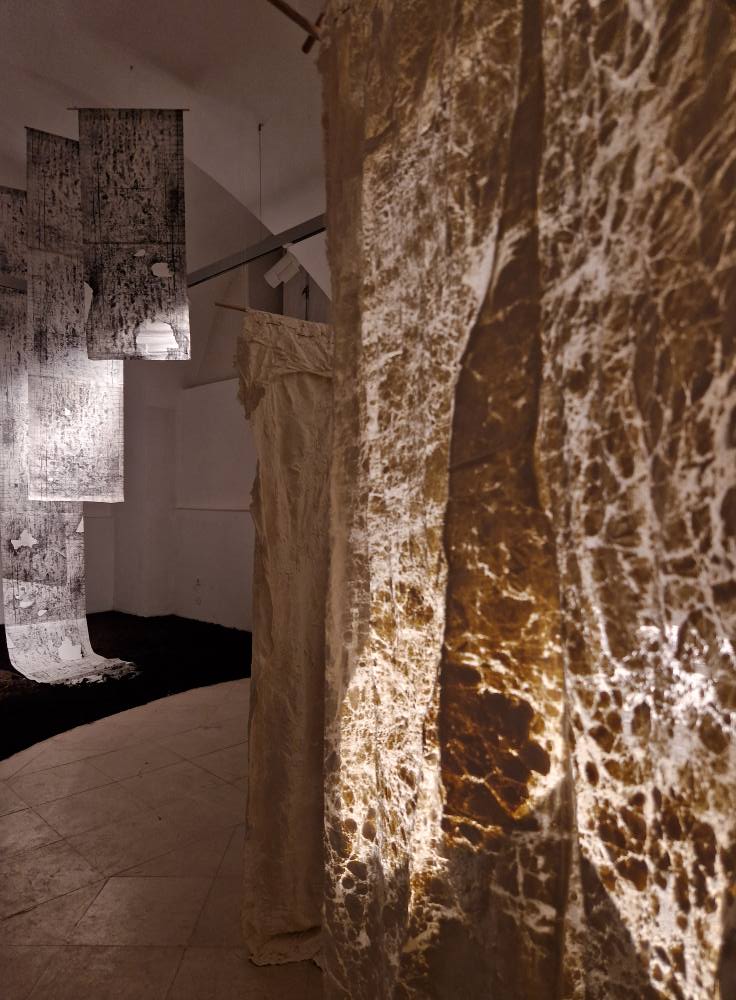 Dominik Višnjić kroz četiri instalacije – Spilja, Falde, Vrt i Tkanje, holističkim pristupom povezuje tradiciju i identitet s umjetnošću (netoksične) grafike. Pritom predstavlja rezultat svog umjetničkog istraživanja u mediju grafike kroz vlastitu inačicu tehnike kolagrafije, izrađujući matricu presavijanjem hammer papira origami tehnikama. Kako navodi Dora Križnik: Inspiriran vlastitim porijeklom i obiteljskom tradicijom tekstilnog rukotvorstva, Višnjić elemente tog manualnog rada inkorporira u svoje umjetničko istraživanje, oživljavajući tradicijske vrednote u novim grafičkim formama kroz različite medije.