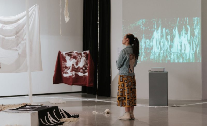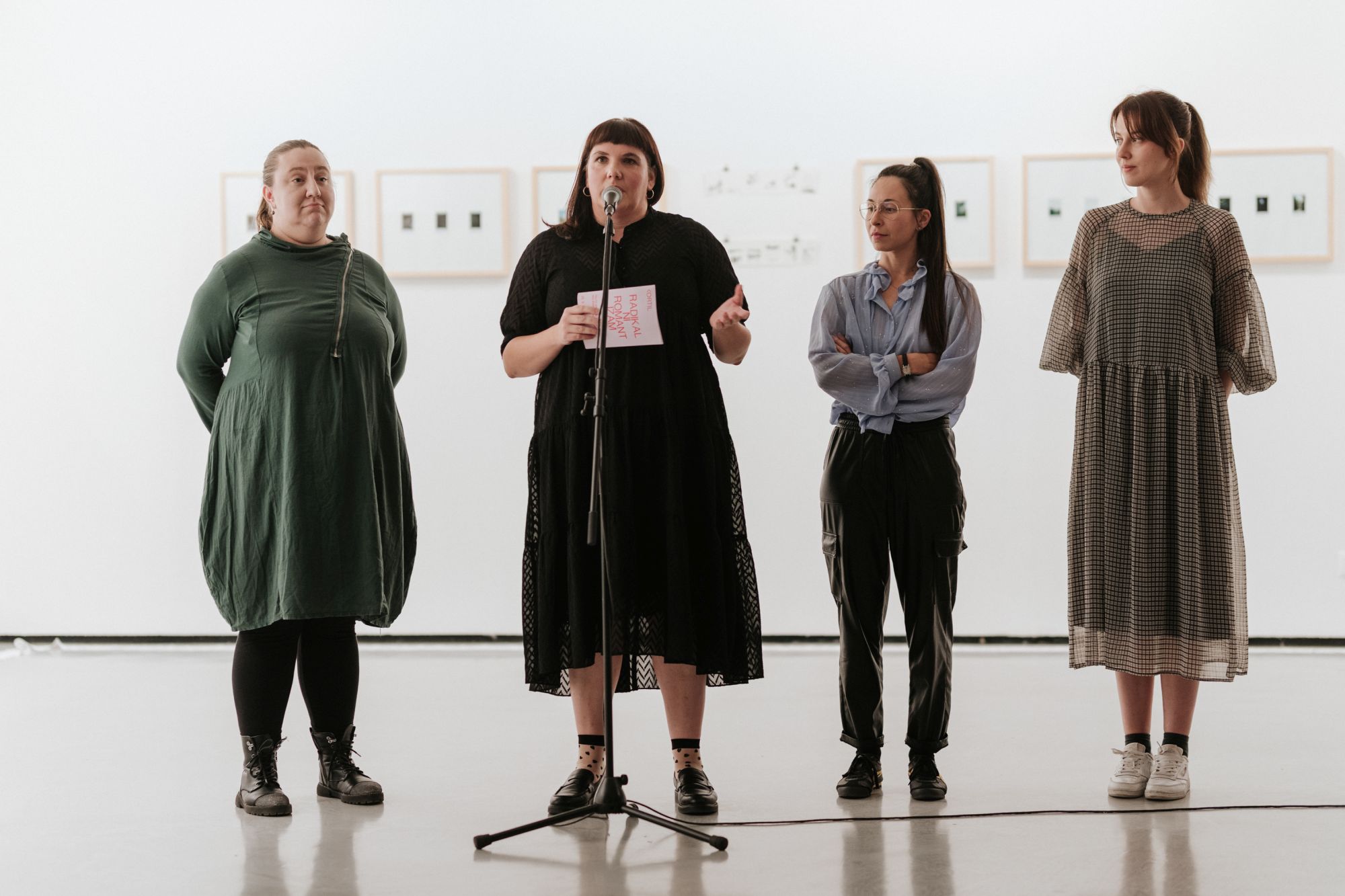 Kroz medije tekstila, fotografije, grafike, slikarstva, teksta, arhiva i ambijentalnih elemenata, umjetnice se suprotstavljaju društveno dominantnim zahtjevima djelovanja, rada i bivanja.